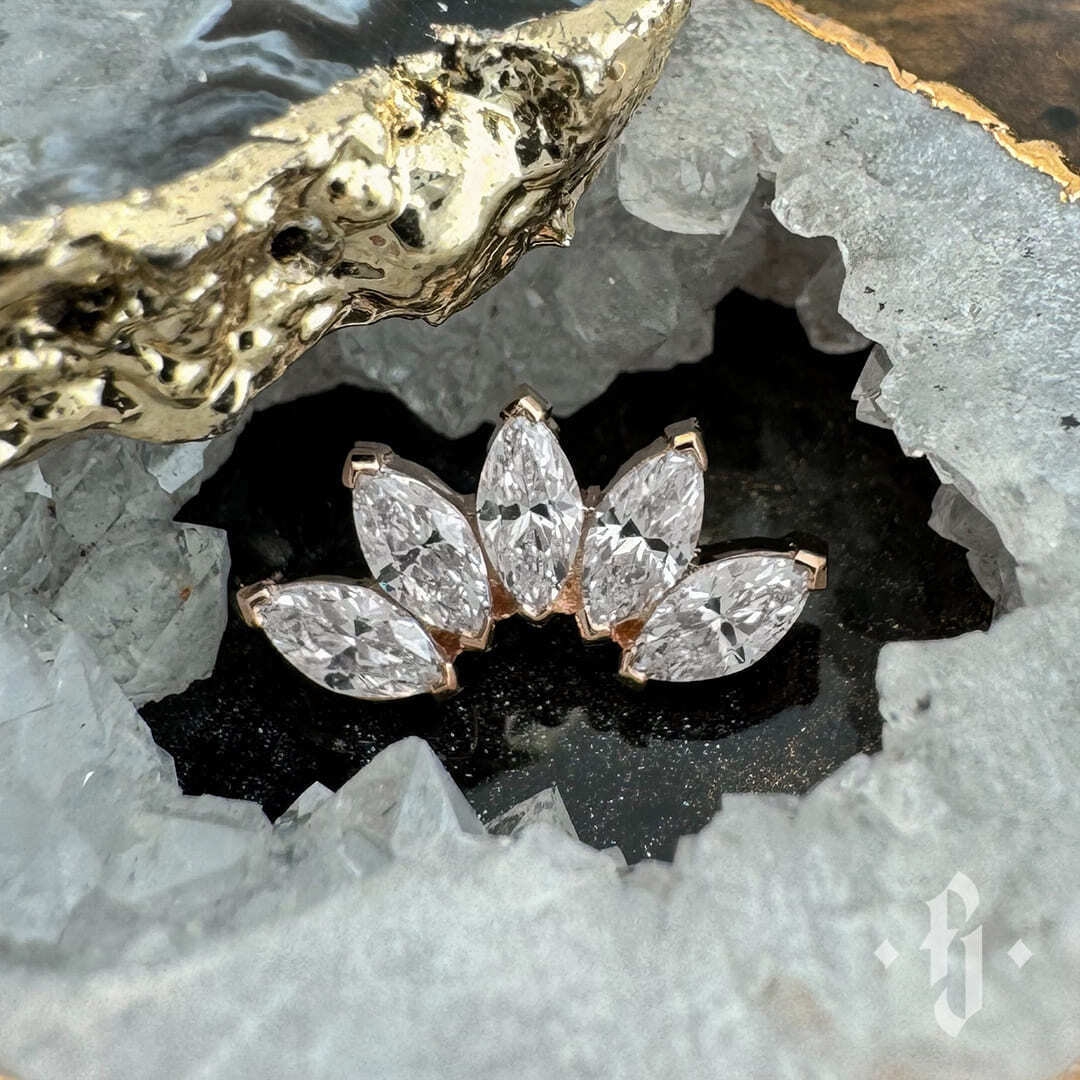 Общая композиция кластера акцентирует внимание на плавности линий и гармонии формы, обеспечивая сбалансированный и аккуратный вид изделия, а вариативность исполнения в разных размерах, делает накрутку подходящей для многих проколов.