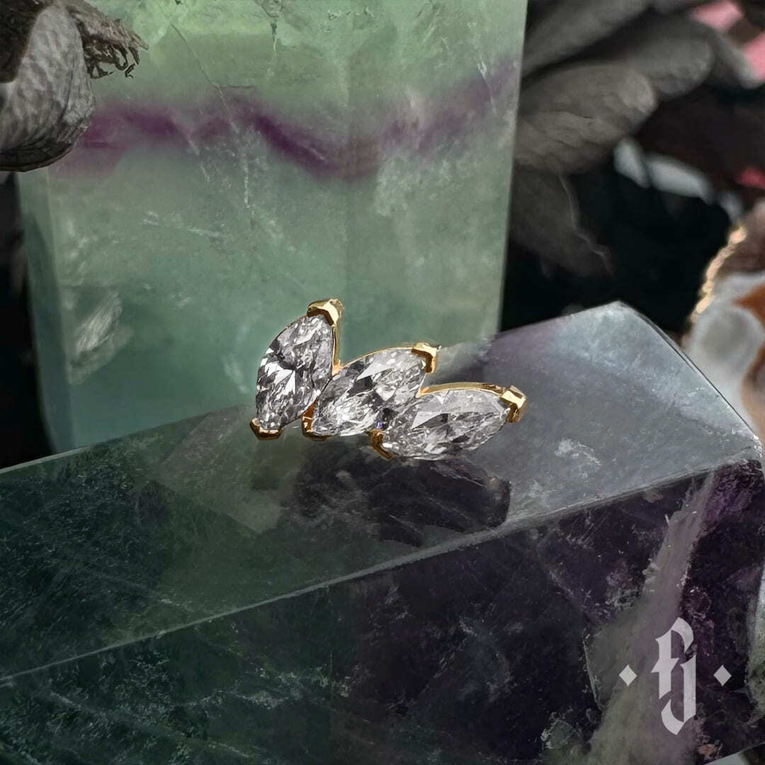 Кластер из трех прозрачных фианитов огранки маркиз. Вставки расположены веером, соединяясь плотно и симметрично, образуя легкий наклон каждого элемента относительно друг друга.