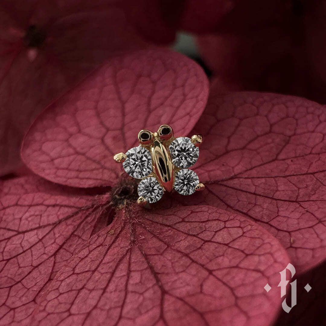 Миниатюрная бабочка с распахнутыми прозрачными крыльями в виде круглых камней. Размеры вставок уменьшаются от верхних к нижним, создавая плавный переход и визуальный баланс. Два более крупных фианита расположены в верхних крыльях, а два чуть меньших — в нижней части.