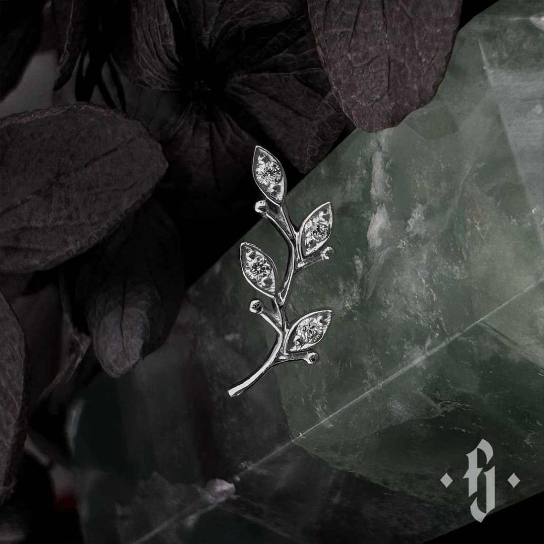 Изящная веточка, напоминающая черешневую. Тонкая изогнутая форма с равномерными изгибами. Овальные, поочередно распределенные по обе стороны стебля листья, с мягко закругленными краями, украшены в центре прозрачным фианитом.
