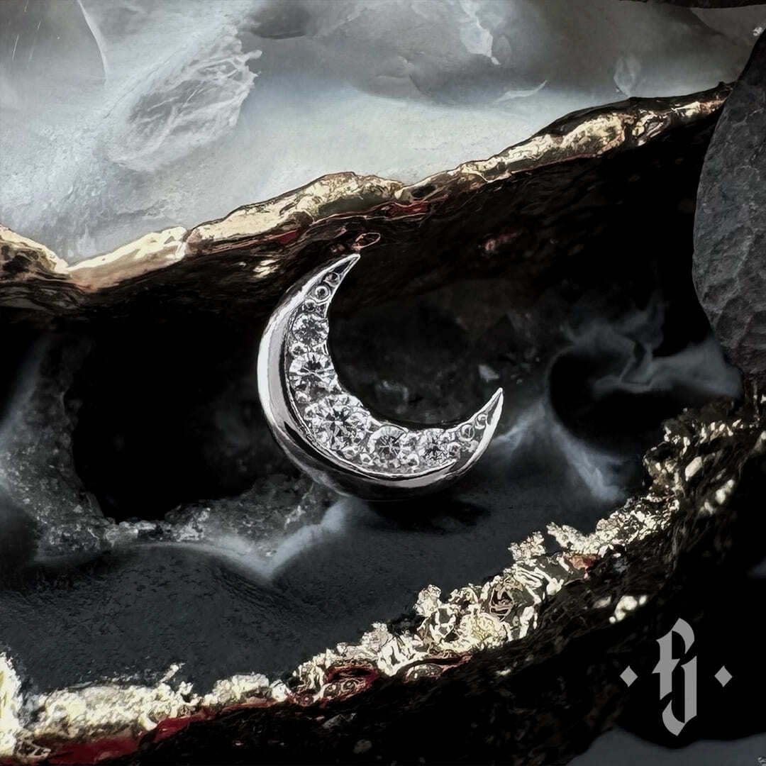 Накрутка в форме остроконечной лунницы - тонкого изогнутого серпа ночного светила. Вдоль внутренней линии внушительного изгиба, превышающего половину воображаемой окружности, равномерно распределились пять круглых прозрачных фианитов. Каждый камень плотно удерживается четырьмя лапками, достигая уникального эффекта слияния красивой игры света разноразмерных камней и идеальной полировки. Гладкая поверхность золота, сочетаясь с окантовкой фианитов порождают гармоничный контраст текстур.