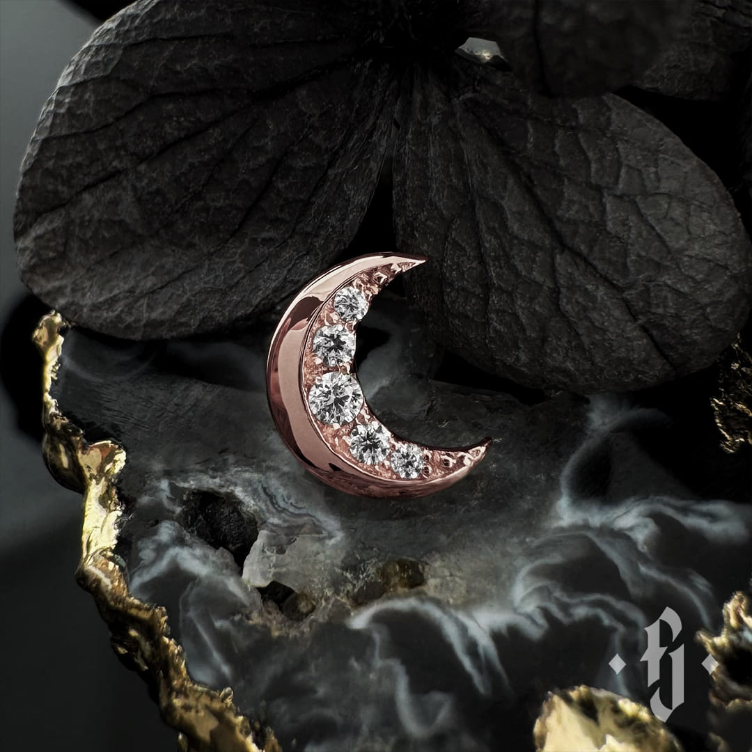 Накрутка в форме остроконечной лунницы - тонкого изогнутого серпа ночного светила. Вдоль внутренней линии внушительного изгиба, превышающего половину воображаемой окружности, равномерно распределились пять круглых прозрачных фианитов. Каждый камень плотно удерживается четырьмя лапками, достигая уникального эффекта слияния красивой игры света разноразмерных камней и идеальной полировки. Гладкая поверхность золота, сочетаясь с окантовкой фианитов порождают гармоничный контраст текстур.
