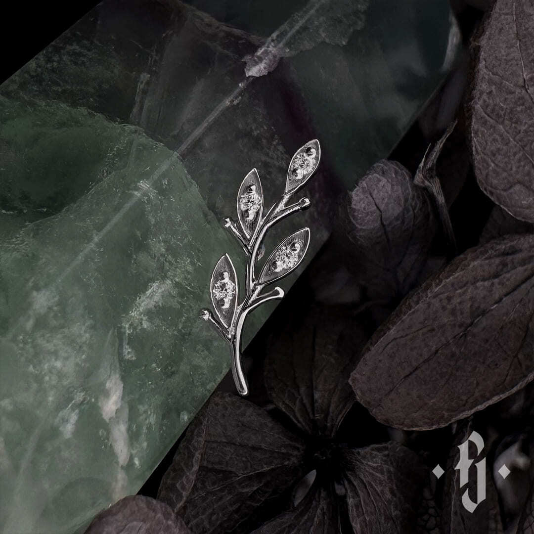 Изящная веточка, напоминающая оливковую. Тонкая, слегка изогнутая основа с аккуратно расположенными маленькими листочками, которые плавно чередуются по обе стороны стебля. Круглые фианиты украшают центр листков. Овальные, удлиненные листья, с мягкими закругленными краями, создают естественный силуэт.