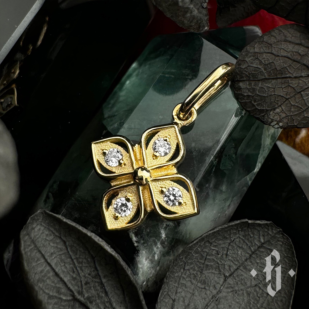 Подвеска выполнена в форме соединяющихся в центральной части изделия четырех лепестков. Каждый лепесток имеет форму ромба с двумя скругленными углами. В центре каждого лепестка закреплен фианит круглой огранки. Между краями лепестков и их центральной частью с фианитом расположены два отверстия вытянутой формы, а между лепестками имеются углубления, создающие дополнительный объем и текстуру.